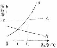 B.温度大于t2℃时,甲、乙、丙三种固体物质溶解度大小关系是甲>乙>丙