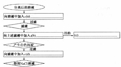 ③分离出Mg(OH)2后的NaCl溶液中还含有CaCl2、Na2SO4等杂质,为了获得NaCl溶液,在分离后的溶液中按照下图所示步骤进行实验即可。请将相关内容填写在图中相应的空格中。