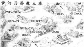 16.(2分)西天取经的“唐僧”--硫酸,不小心独自一人走进了有许多“吃唐僧肉妖怪”(即能与硫酸发生化学反应的物质)的魔王寨,你可要帮助他走出山寨哦。(请用图中物质前的序号连接起来表示所走的路线):入口→_________→出口。