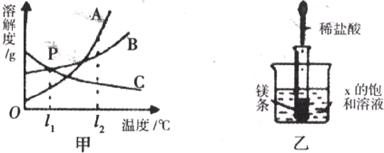 (2)如乙图所不,20℃时,把试管放入盛有X的饱和溶液的烧杯中,在试管中加入几小段镁条,再加入5mL盐酸,立即产生大量气泡,同时烧杯中出现浑浊,则X可能是A、B、C三种固体物质中的__________。