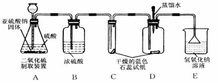 ②装置D中胶头滴管中的蒸馏水在二氧化硫气体生成之前滴到蓝色石蕊试纸上,未见试纸颜色发生变化,此现象说明 ,当有二氧化硫气体通过时发现湿润的蓝色石蕊试纸变红。此现象说明 ,此过程中反应的化学方程式为 。