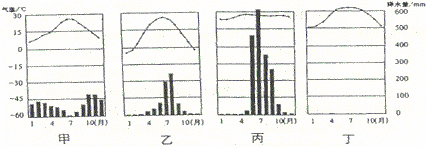 12.分布在我刚C方地区的气候类型是: A.甲 B.乙 C.丙 D.丁