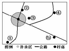 2005年世界一些地区爆发了严重的禽流感,我国政府采取了严格的防御对策:疫情发生地3千米内家禽全部扑杀;3-5千米内强制免疫,10千米内活禽市场必须关闭。读我国某乡镇禽流感疫情分布图,(图中扑杀区半径的图上距离大约为1厘米),回答19-20题。