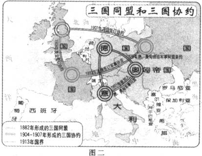 22.观察图二(图为三国同盟和三国协约,图略),请将下列国家的英文字母代号填入图中相应的圆卷内(3分)