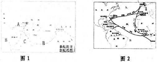 ①请指出图1中麦哲伦航行的是哪条路线。(写出其字母代号)(2分)你知道在麦哲伦航海之前西方国家进行航海的还有哪些航海家?列举两位。(2分)
