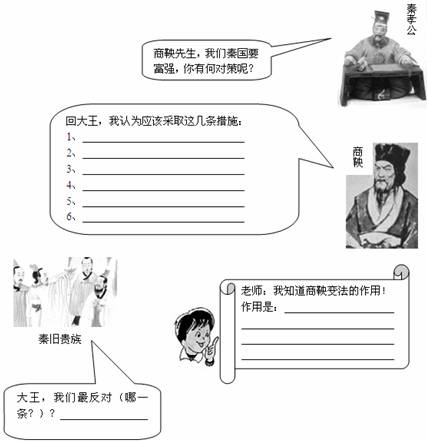 29、(走进历史,感受古人)公元前356年的一天,秦孝公召集商鞅等大臣讨论富国强兵之策。请你完成下面的填空 :(6分、1分、2分)