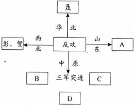 19.这是一幅刘邓大军挺进中原略图,请你判断图中A、B、C、D四路大军,哪一路是刘邓大军?