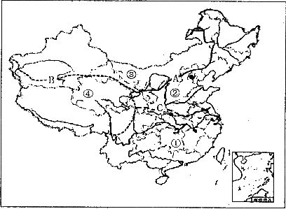 (4)序号①②③④分别表示_________,_________,__________,___________省,其中海拔最高的是__________,①区域的植被景观是____________________。