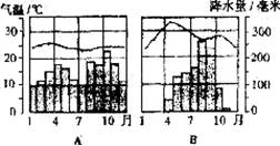 32.读图,A、B两图是两类气候各月气温和降水量的分配图,回答下列问题(12分)