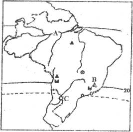 (2)巴西最大的铁矿B是______________铁矿,水电站C是______________水电站。(4分)