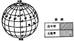 13.下图为地球仪模型图,请根据图上的经纬度按图例表达方式在图上画出西半球和北温带的区域范围。(3分)