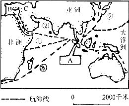 (2)图中的航线①从我国沿海出发,经过该海峡后,向西往亚洲与非洲的分界线 运河,可到达地中海(B处)。