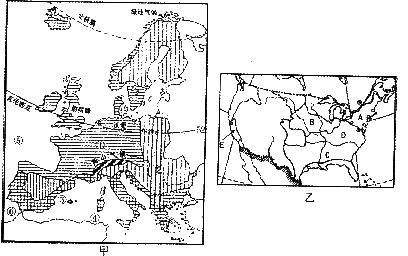 (4)图甲中,沿52゜N纬线年降水量向 方向逐渐减少。