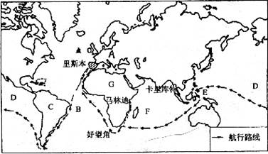 1519年,在麦哲伦的带领下,二百多名探险队员分乘五艘船,从A 洲的西班牙里斯本出发,横渡B 洋,绕过C 洲的南端,进入D 洋。一路上历尽千辛万苦,于1521年3月到达E 洲的菲律宾群岛。麦哲伦因介入当地纠纷而身亡。船员们艰难地横渡F 洋,绕过G 洲南端,最后只剩下一艘船和十几名船员,于l522年9月回到西班牙。