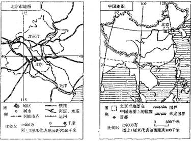 (2)在A图上量一下从北京到天津的图上距离为 cm,根据A图所提供的比例尺,计算一下两地之间的实地距离约为 千米。
