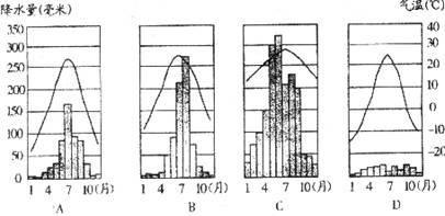 (2)ABCD四城市中,位于季风区的是 ,该地区气温和降水配合特点是