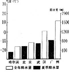 (3)下图中的4个城市中, (城市名)夏季降水占全年降水量的比重最大;全年降水量最多的是 (城市名)