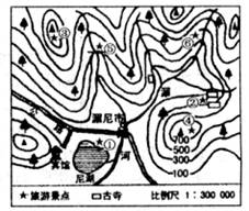 12.小玲在旅游学校学习.为了增长自己的实践经验,暑假期间,她到“湄尼风景区”当了一回见习导游。湄尼风景区主要的旅游景点有“山顶观日出、尼湖风光、远眺尼湖、银河飞瀑、漂流探险、古寺揽幽”等等。小玲遇到了一些麻烦,她只知道这些景点分布于下图数码所表示的各地点,但不知道每个地方具体的景点是什么。小玲很着急,这导游怎么当啊!(5分)