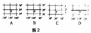 2、图2四图中,哪一幅图中的P点位于东半球、北半球、并且与“坐地日行八万里”诗句最吻合( )