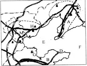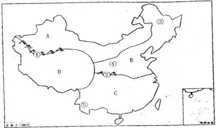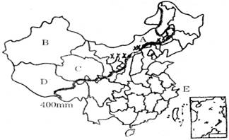 (2)图中从内蒙古东北部向西南到D自治区东南部的分界线是_______________________线,此线东南部地区比西北部地区降水量________________________________________,原因是______________________________________________________________________________;此线以东,主要分布着_______________植被,此线以西,主要分布着_______________植被。
