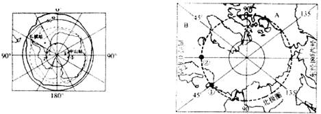 近年来,我国在南极地区相继建成了长城站(62°13’S,58°57’W),中山站(69°22’S,76°22’E)在北极地区也建立了黄河站(78°55’N,11°56’E),不久还将建立第三个南极科学考察站(80°2’S,77°21’E)。结合两图。回答下列问题。