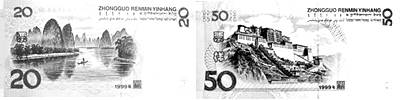 16、20元和50元人民币上所显示的景观分别是