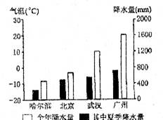 (1)从上图中可以看出,我国东部地区降水的空间分布规律是 ,从降水的季分配来看四城市中 (城市名称)夏季降水占全年降水的比重最大。