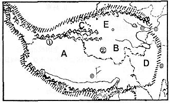 A_______自治区 E______省 F_______市 B______高原 ①______山