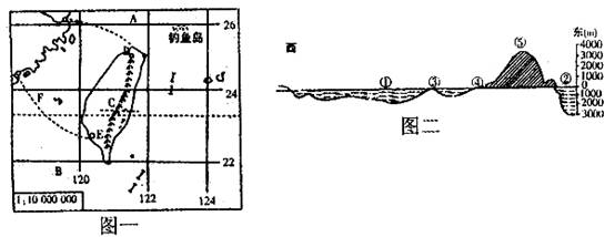 23.读台湾略图(图一)及“台湾省地形剖面图(沿北回归线)”(图二),回答下列问题(5分)