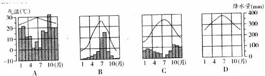 (2)A、B、C、D四城市中,气温年际变化最大的是__________,降水量季节变化最大的是______________。