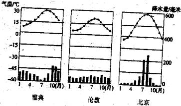 12.2004年、2008年、2012年夏季奥运会分别在雅典、北京和伦敦举行,下面是三地的气候资料图,据此判断下列说法正确的是
