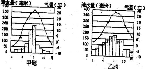 (1)甲、乙两地中一月气温低于0℃的是_______地,气温年较差较小的是_______地。