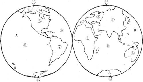 两极:(填字母代号)_______ 东西半球:A_______ B_______