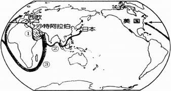(2)图中运输线路 ① 途经阿拉伯海 、 、 地中海 、大西洋,石油主要运往 和 ;线路 ② 经过位于东南亚的重要海峡 ,此运输线被日本称为“ ” ;线路 ③ 绕道非洲南端的 ,主要运往 和 。在三条运输路线中,运量最大的是 。