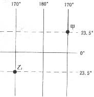 C.甲在低纬度,乙也在低纬度 D.甲点的地理坐标为170°W,23.5°N