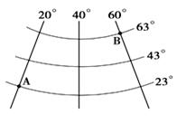 (1)A、B两点的经纬度是:A点位于北纬 度,东经 交点处。;B点位于北纬 度,东经 交点处。