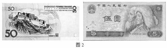 人民币号称中国的名片。人民币上的景观素描浓缩了我国风景名胜的精华,人民币上的许多人物肖像是我国民族团结现状的写照。请根据下列两张人民币上的图案(图2),回答21-22题