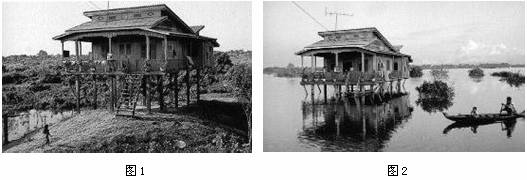 读恒河三角洲某民居在不同季节的景观图(图1、图2),回答18-19题。