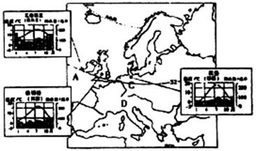 (2)由气温曲线和降水柱状图可知,A、B、C三城市自西向东