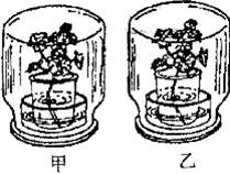 如下图实验装置甲的槽里盛的是氢氧化钠溶液,装置乙的槽里盛的是清水;将两装置放在黑暗处一昼夜,然后放在光下几小时,从甲、乙装置中各取一片叶,经脱色、漂洗后,加碘液处理。