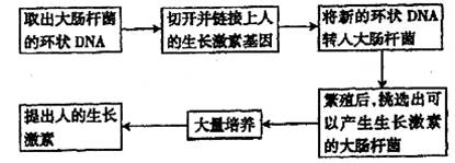 20、生长激素具有促进人体生长的作用,在临床上可以用来治疗侏儒症,科学家把人的生长激素基因导入细菌,从而形成了能够产生激素的“工程菌”。下面是“工程菌”的培育过程图解,请据图分析: