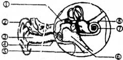11.参照下图分析判断:“遇到巨大声响迅避张口以免被震破、将鼓膜的震动传导内耳的、将外界声波刺激转变为神经冲动的、将神经冲动传导大脑皮层听觉中枢”的结构依次是