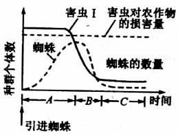 23.随着对环境保护的重视,对农业害虫可采取综合防治的措施。为除去有害于农作物的某种害虫I而引入捕食蜘蛛后,对这两个种群数量变化进行调查,得出如右图所示的结果。下列关于此过程的推理中正确的是