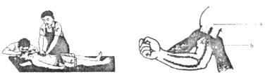 (2)右图表示某人外出血时,血液暗红色,连续不断地从伤口流出,该病人损伤的血管类型是 ,救护者采取指压止血法急救,由此判断病人伤口在 处(a或b)
