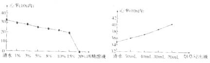 (3)分析左图,你得出的结论是 ,当酒精体积分数达到 %时,水蚤停止心跳死亡。