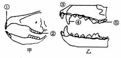 (2)甲图是 的牙齿,乙图是 的牙齿。判断的理由是家兔的牙齿没有 ,而狼的牙齿有,这是与它们的 相适应的。