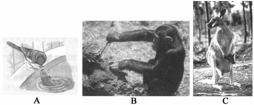 A.小鸟喂鱼 B.黑猩猩钩取食物 C.幼袋鼠在母袋鼠的育儿袋中吃奶