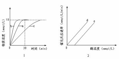 (1)图1中的a是在谷氨酸起始浓度为10mmol/L、最适温度、最适pH值、酶浓度固定的条件下得到的曲线。请给该曲线拟定一个合理的名称。 。b、c两曲线是通过改变温度、酸碱度或酶浓度得到的曲线,图1中曲线b产生的最可能原因是 ;导致曲线c出现的原因可能是 。
