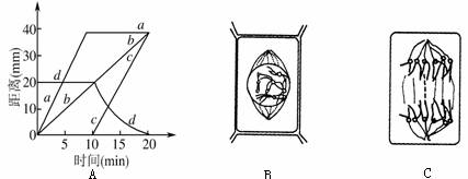 (1)能表示染色体的着丝点与纺锤丝的相应极之间的平均距离线是A图中的 。该细胞一个周期要持续 分钟;B图图像出现在A图0- 分钟;细胞板出现应在A图中 分钟以后。