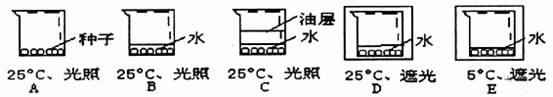下图表示探究种子萌发环境条件的实验装置,每个烧杯均放有等量的干燥种子(10粒),并提供相应的环境条件。